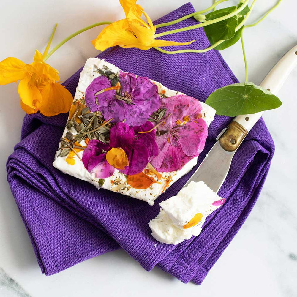 Fresh goat cheese adorned with edible herbs and flowers to symbolize a spring garden